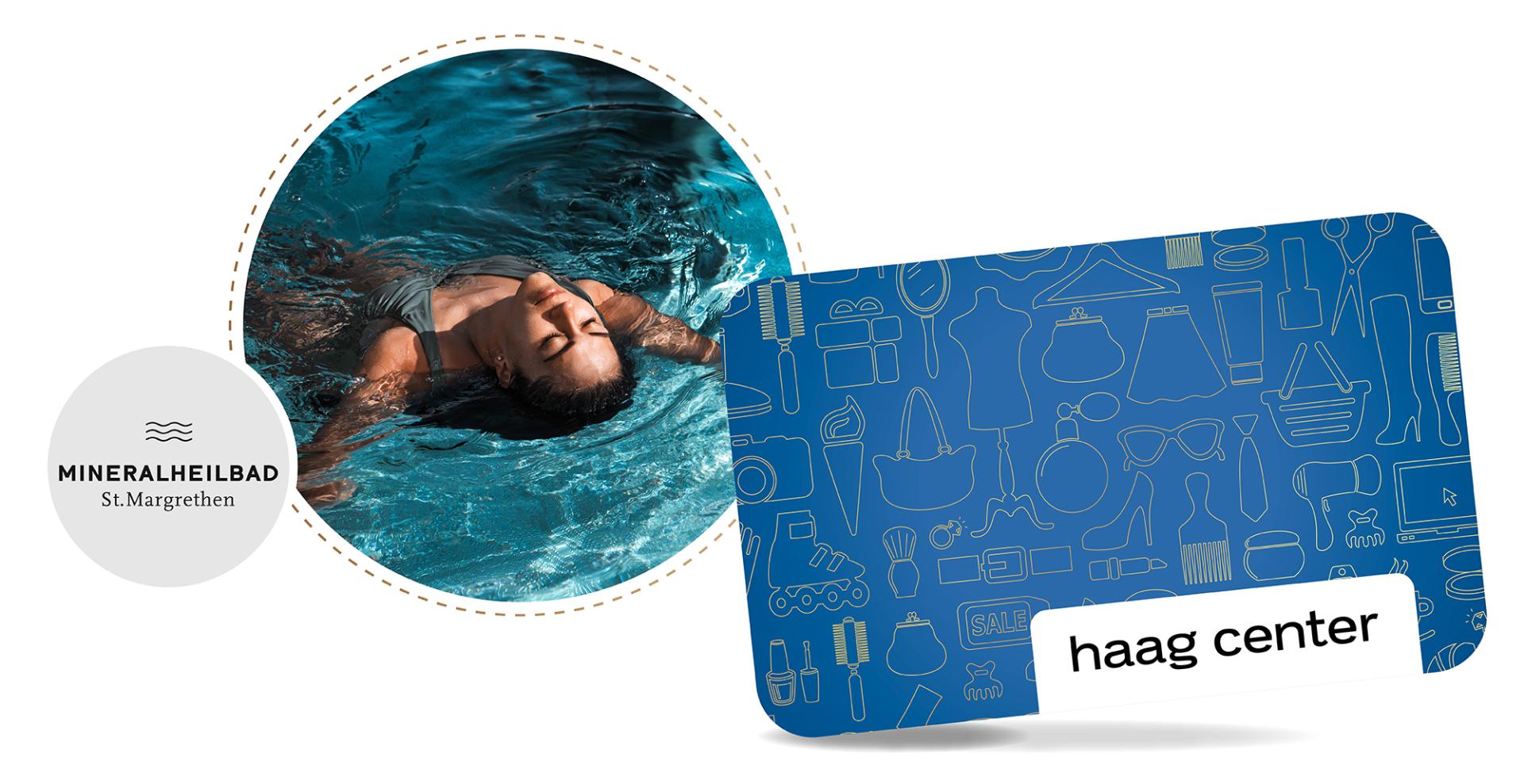 Beim Kauf einer Haag-Center-Geschenkkarte im Wert von CHF 100.- schenken wir den zweiten Eintritt ins Mineralheilbad St. Margrethen im Wert von bis zu CHF 60.- dazu.